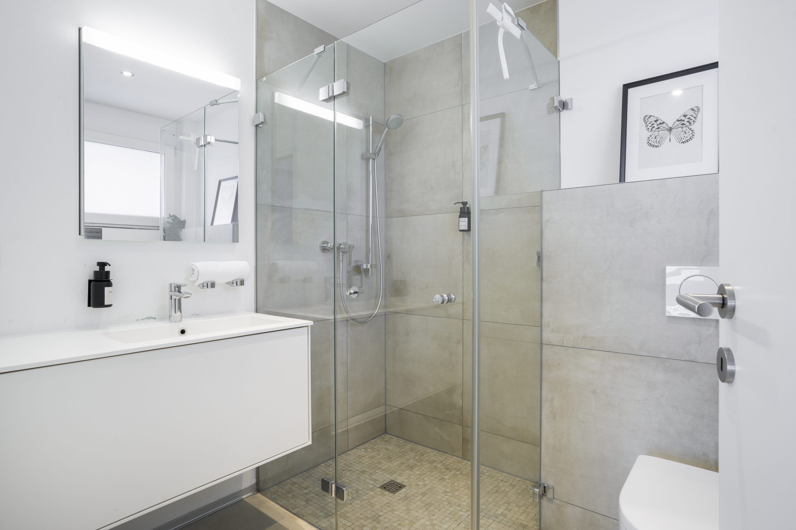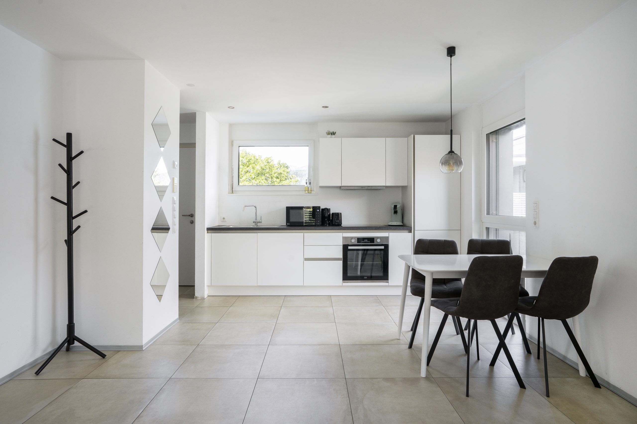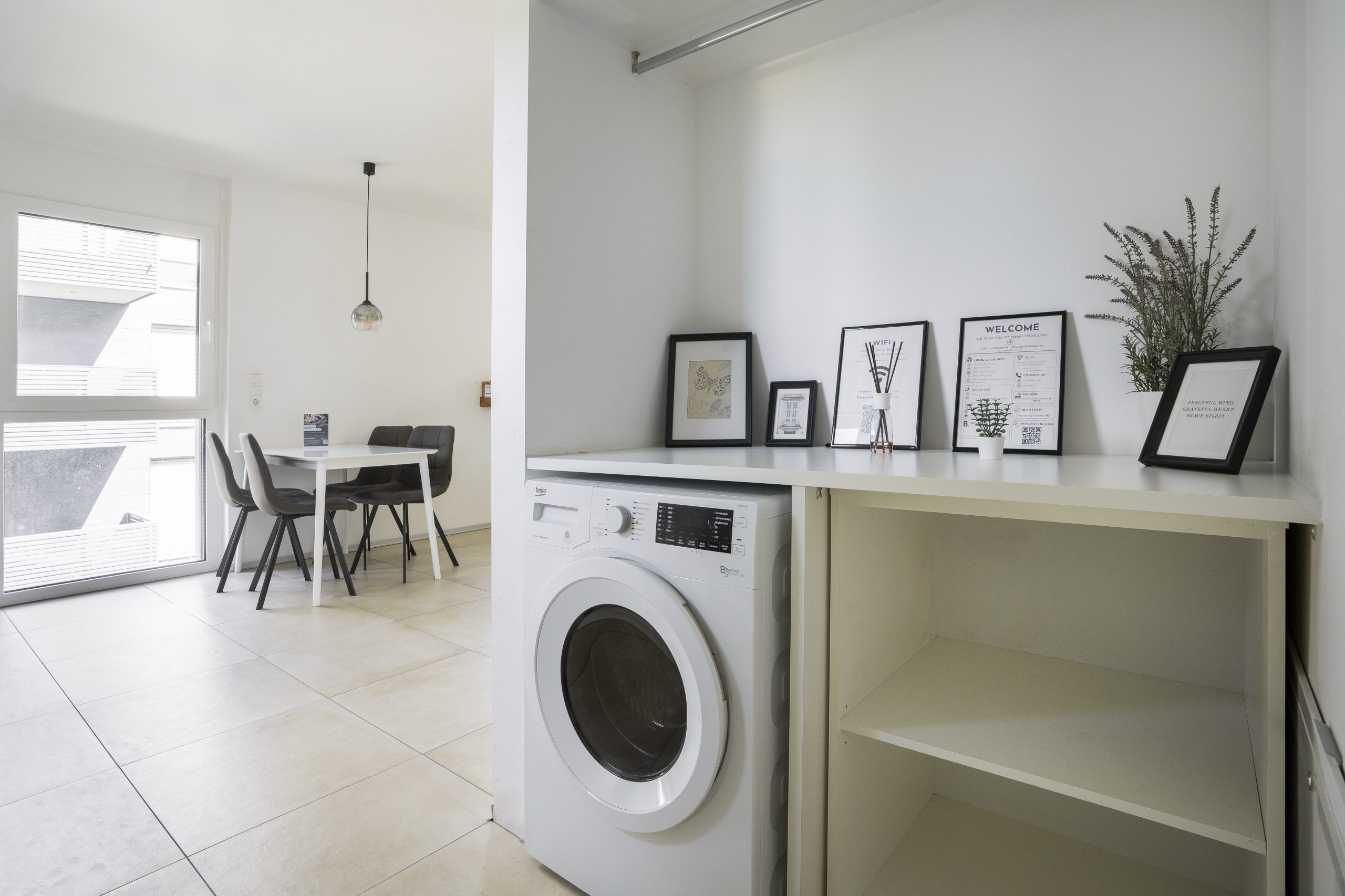 Die voll ausgestattete Küche verfügt über ein Kochfeld, einen Kühlschrank, einen Geschirrspüler sowie sämtliche Küchenutensilien für einen angenehmen Aufenthalt. Weitere Ausstattungsmerkmale sind eine Waschmaschine, ein eigener Eingang, schallisolierte Wände und ein Flachbild-TV mit Streamingdiensten.