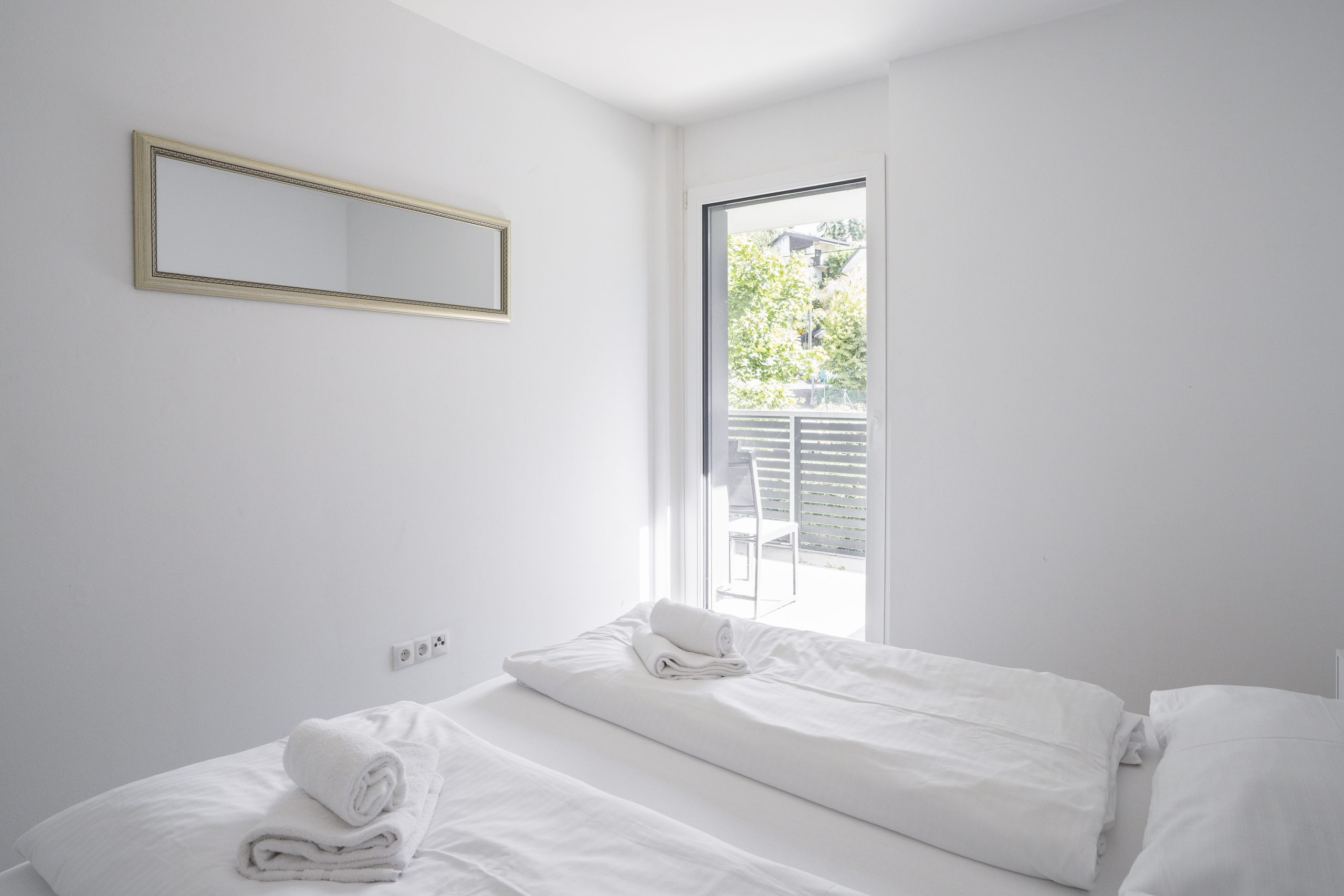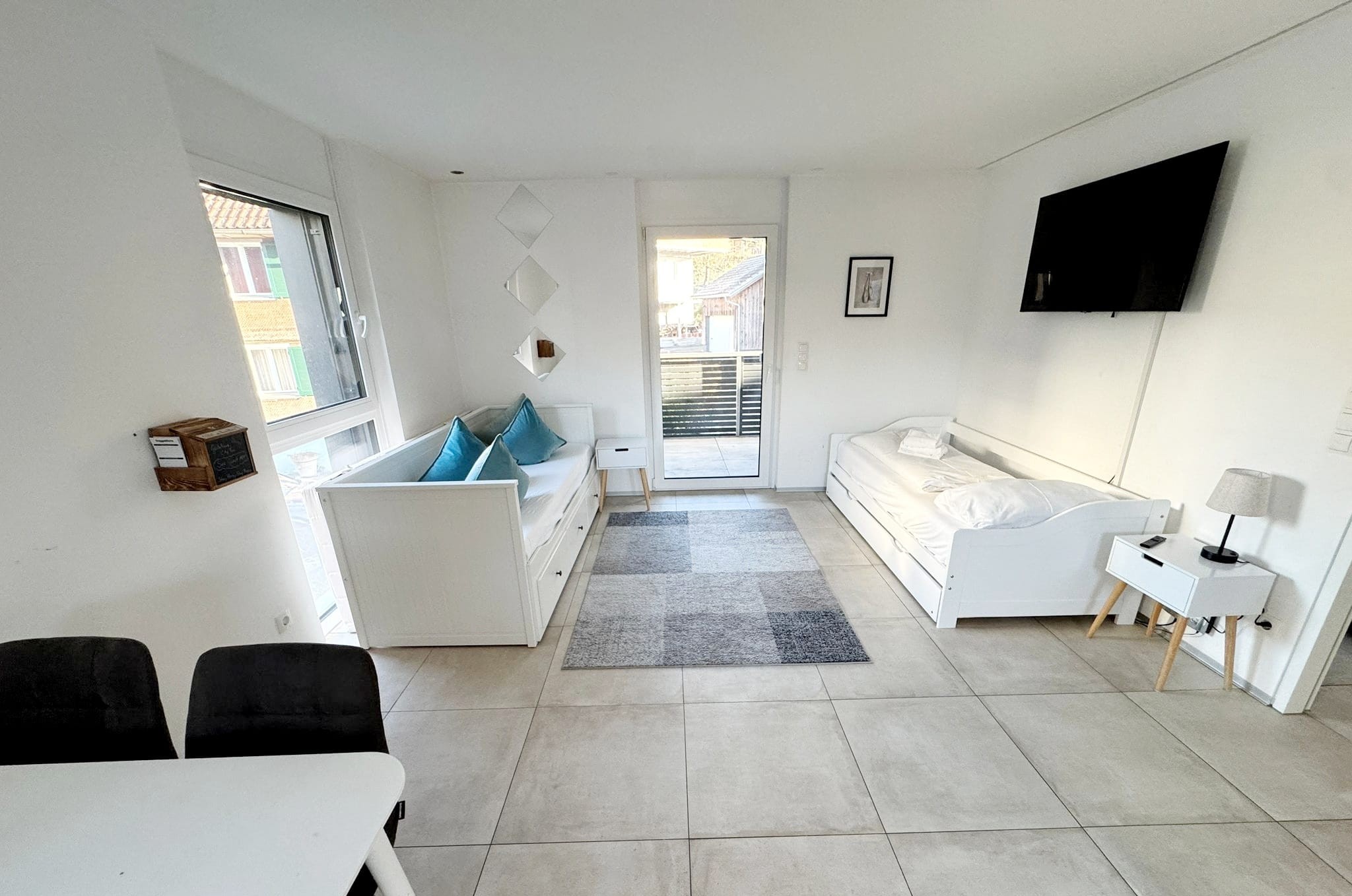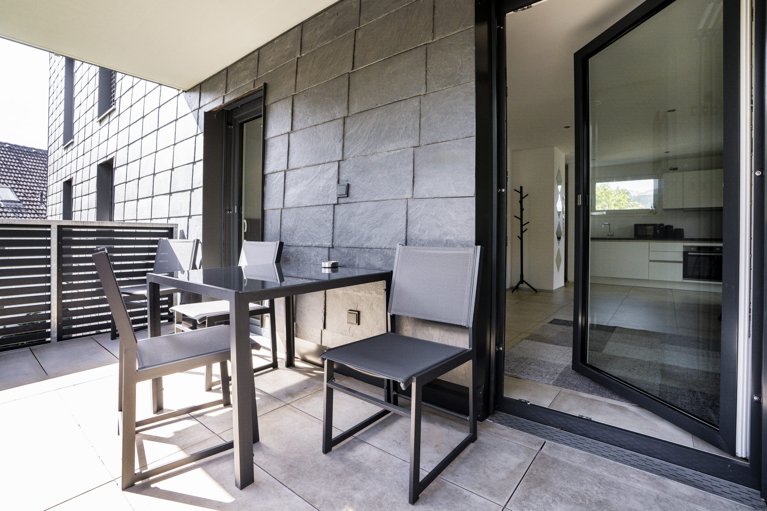 Der Balkon bietet einen herrlichen Blick ins Grüne und ist mit einem Tisch und Stühlen ausgestattet – ideal für entspannte Stunden im Freien.