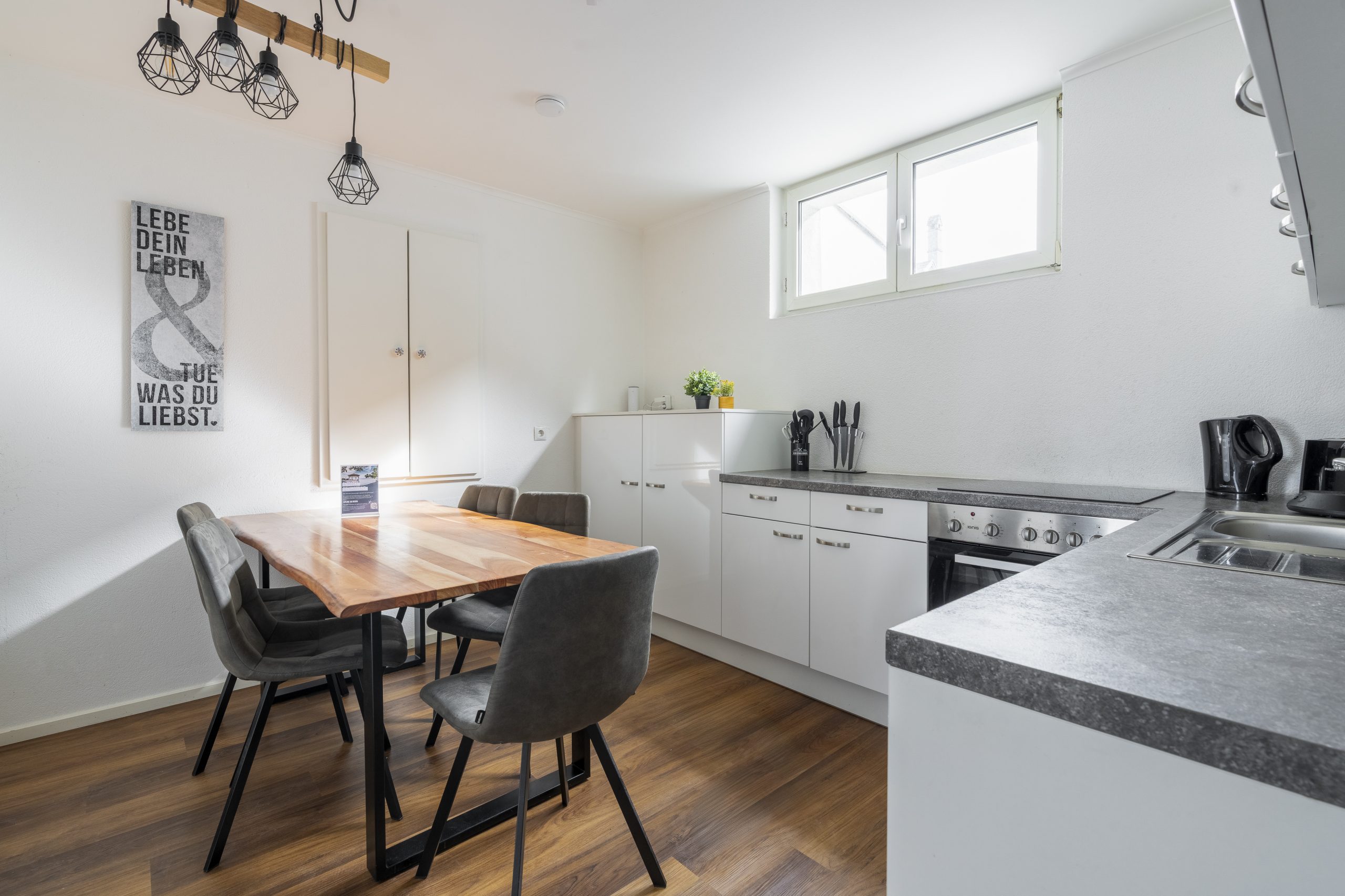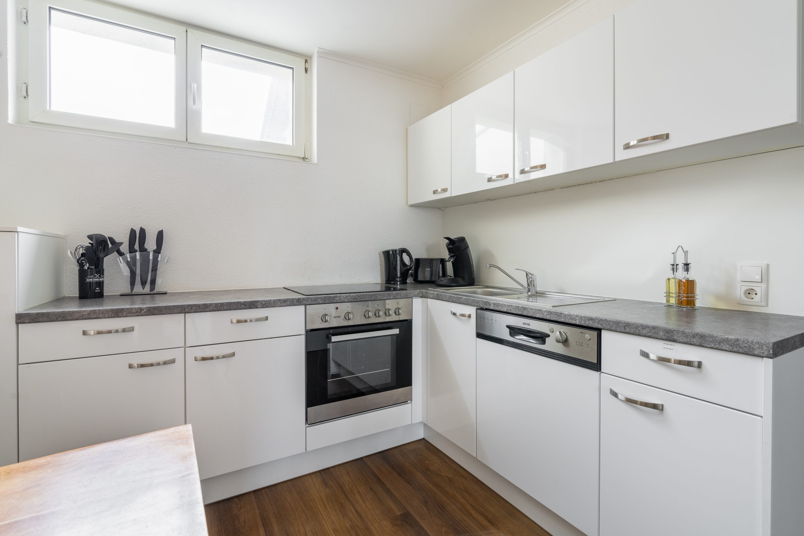 Die voll ausgestattete Küche umfasst ein Kochfeld, einen Kühlschrank, eine Spülmaschine und diverse Küchenutensilien.