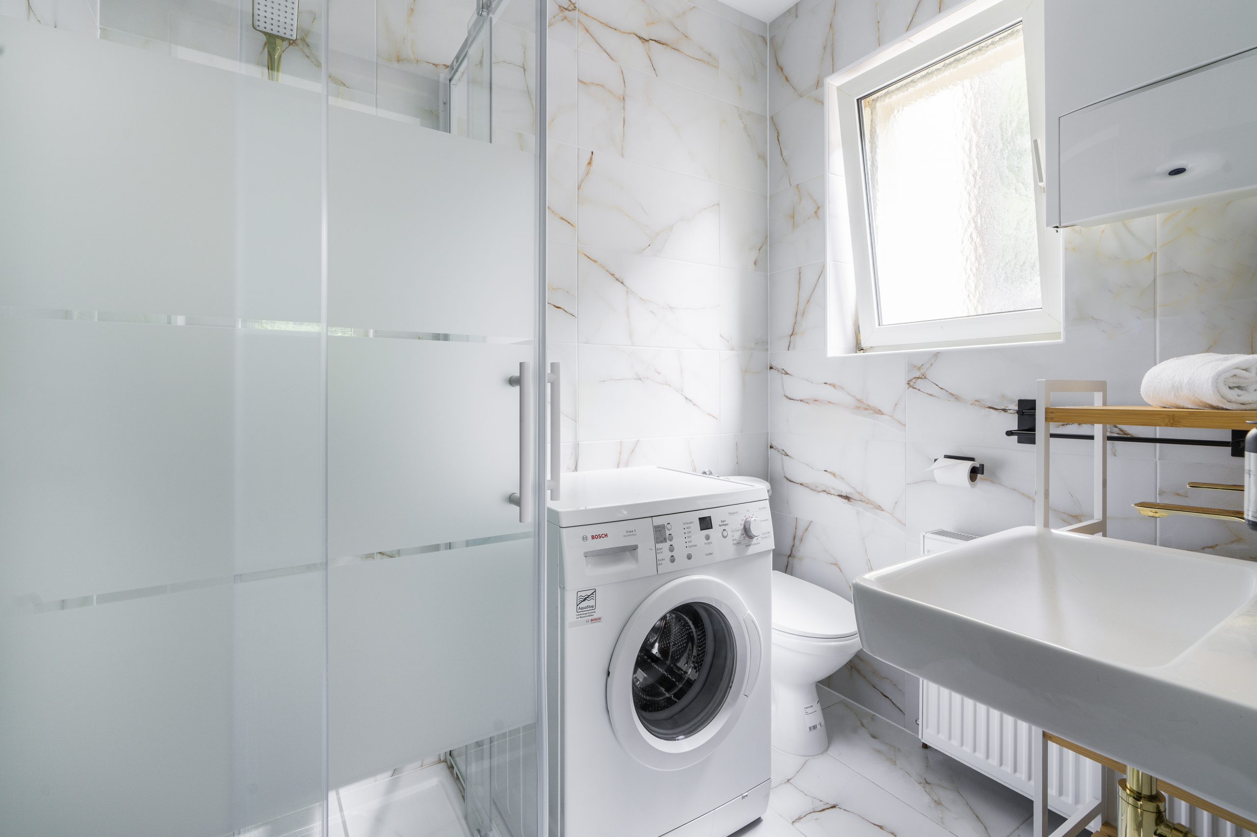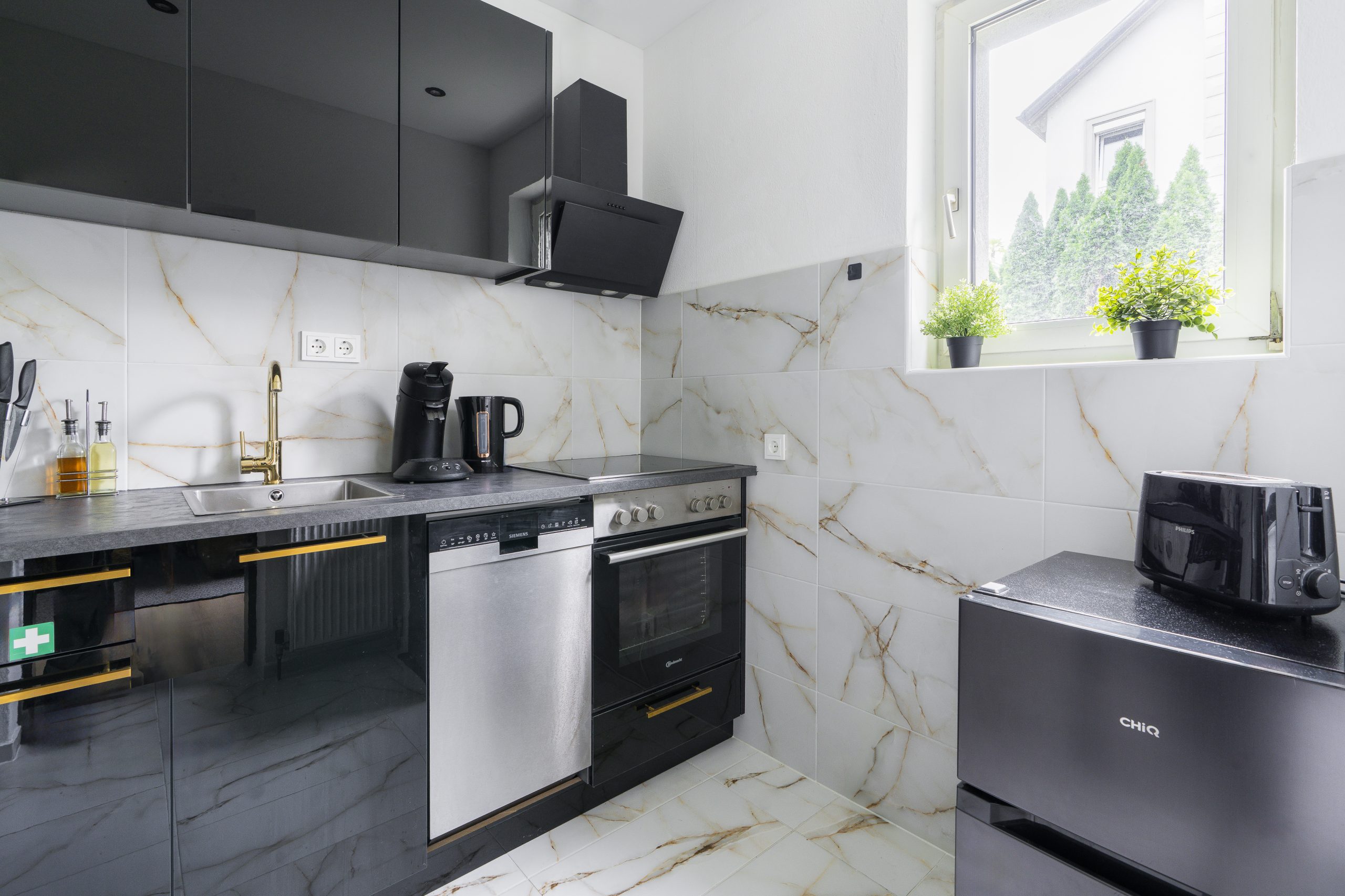 Die voll ausgestattete Küche lässt keine Wünsche offen: Sie finden hier ein Kochfeld, einen Kühlschrank, eine Spülmaschine sowie sämtliches Kochgeschirr. Für zusätzlichen Komfort sorgen eine Waschmaschine, schallisolierte Wände, eine Kaffee- und Teestation sowie ein Flachbild-TV mit Streamingdiensten.